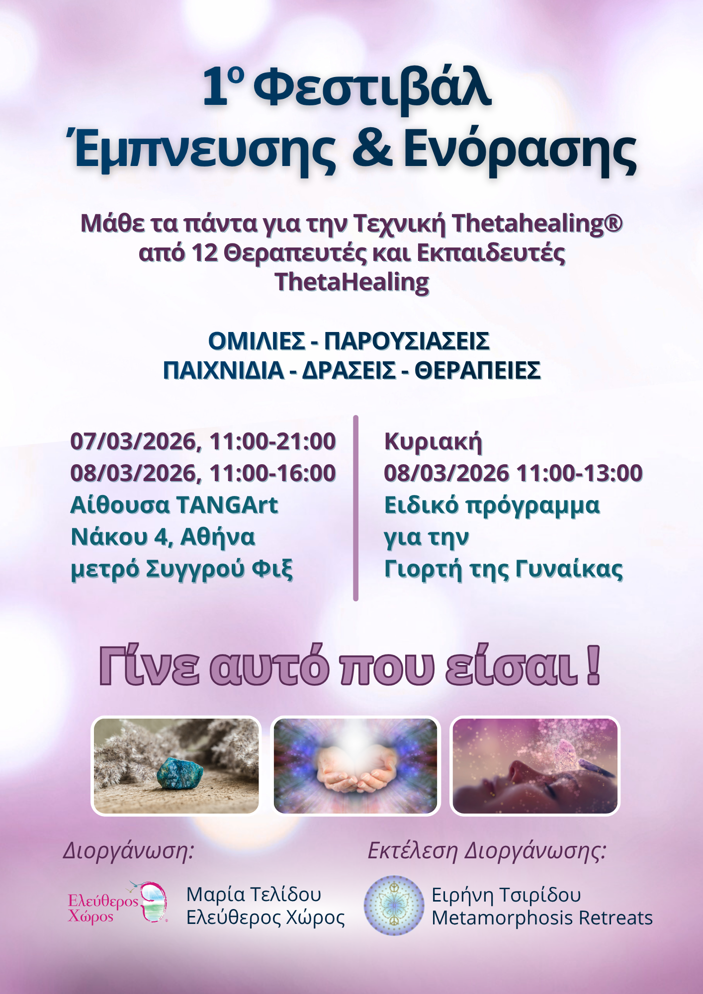 🌿 1ο Φεστιβάλ Έμπνευσης και Ενόρασης Σάββατο 07 Μαρτίου 2026, 11:00 – 21:00 Κυριακή 08 Μαρτίου 2026, 11:00 – 16:00 περίπου Μια μοναδική γιορτή θεραπείας, έμπνευσης και προσωπικής ανάπτυξης Αγαπητέ/ή φίλε, Με μεγάλη χαρά και ενθουσιασμό, σας προσκαλούμε να συμμετάσχετε […]